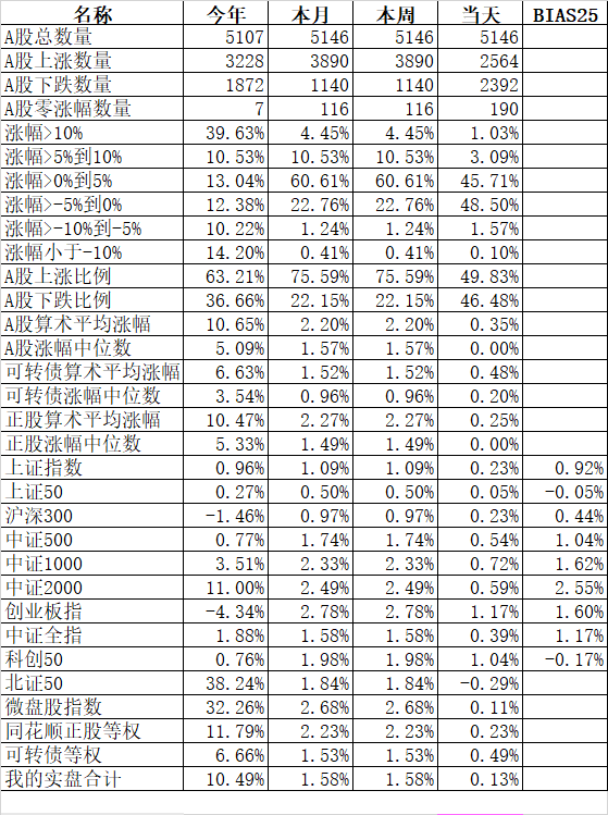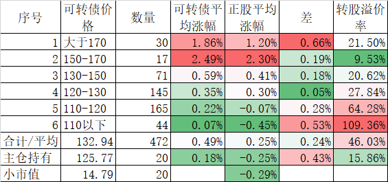 472只可转债平均上涨0.49%,对应正股平均上涨0.25%。我的主仓20只可转债平均上涨0.18%,对应正股平均下跌0.25%。